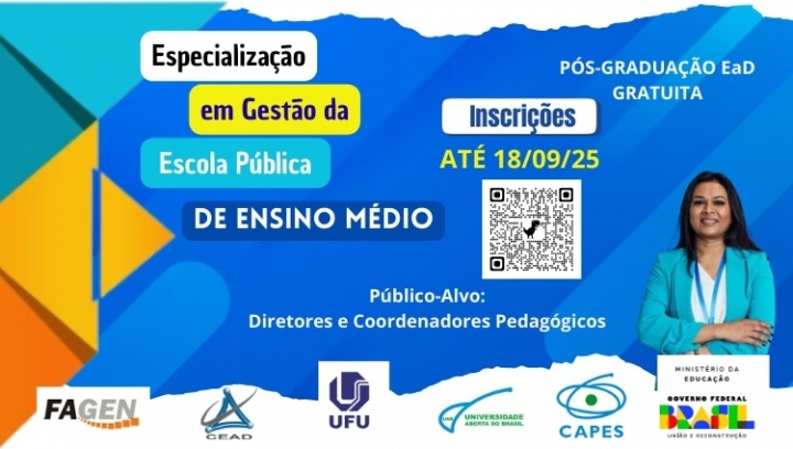 A Universidade Federal de Uberlândia (UFU), por meio da Faculdade de Gestão e Negócios (FAGEN) e do Centro de Educação a Distância (CEaD), informa que o prazo de inscrição para o curso de Pós-graduação Lato Sensu em Gestão da Escola Pública de Ensino Médio (GEPEM) foi prorrogado até o dia 18 de setembro de 2025.